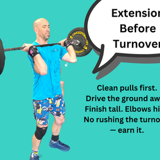 We reinforce that the clean is not about yanking the bar upward. It’s about achieving powerful extension and then pulling yourself under the bar.