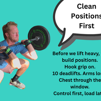 Hook grip on.10 controlled deadlifts.Arms long.Chest through the window.